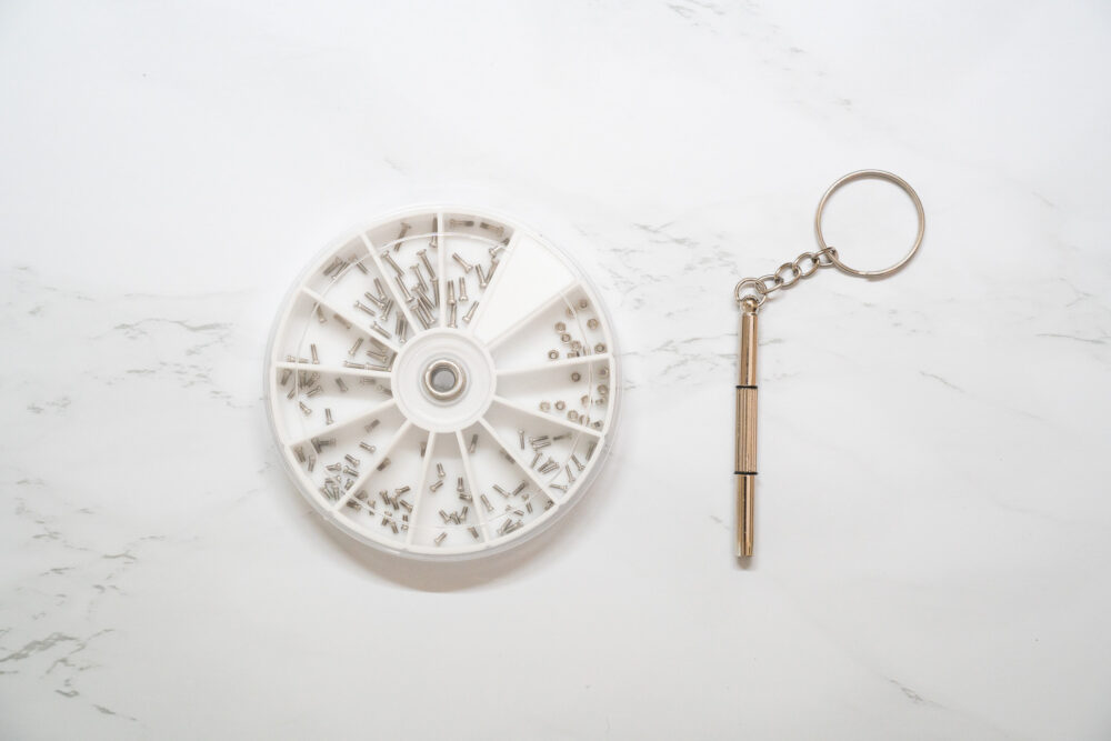 それでは早速修理していきましょう。必要なのはこちら。メガネに使われているネジ・ナットがひと通り入っている修理キットです。