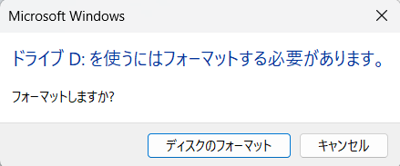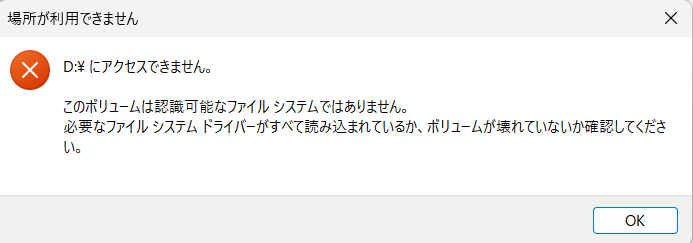 - Windows:「ドライブD:を使うにはフォーマットする必要があります。」「D¥にアクセスできません。」が表示される