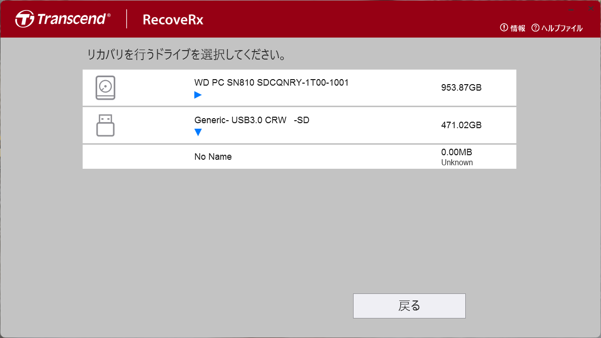 それではデータ復元アプリを使っていきましょう。まず使用したのはトランセンド社の「recoveRx」です。私が使ってたSDカードのメーカーが出してるから、という理由です。