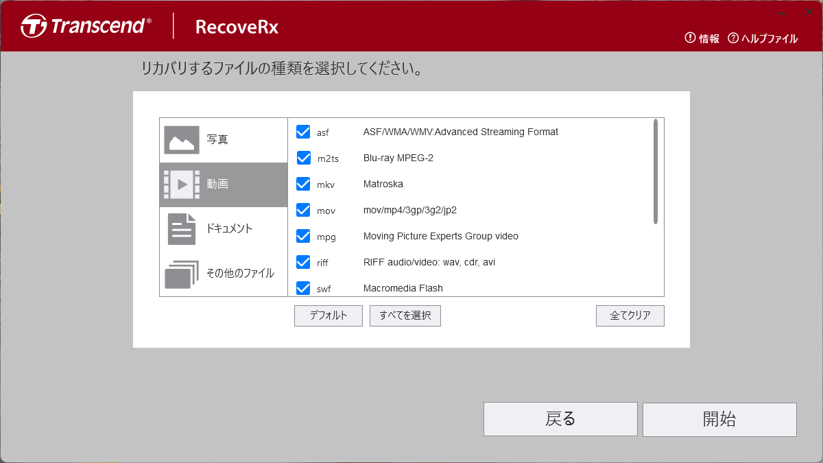 リカバリーしたいファイルを選びます。今回は動画に全てチェックを入れ、開始します。