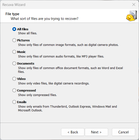 まずは探したいファイルタイプの選択画面。迷ったら「All Files」で大丈夫です。今回のように動画だけを復元したいのなら「Video」でもOK