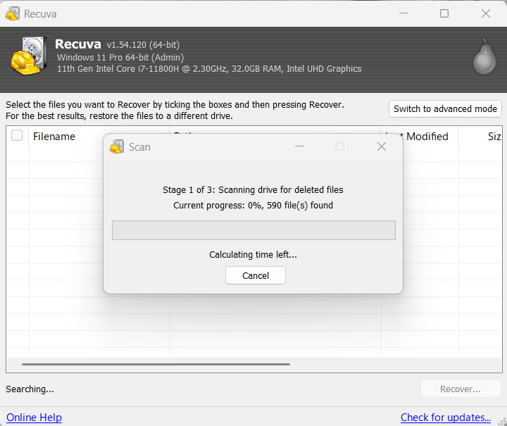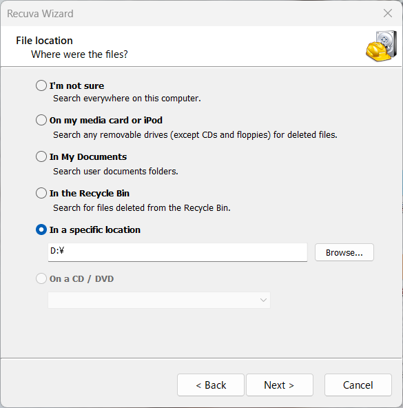 諦め切れず、別のフリー復元ソフトを使ってみます。今回は「Recuva」という評判の良い無料ソフトをダウンロードしました。