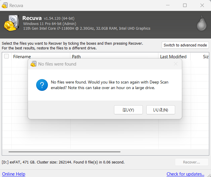 ファイルが見つかりませんでした。詳細スキャンを有効にして再スキャンしますか?
