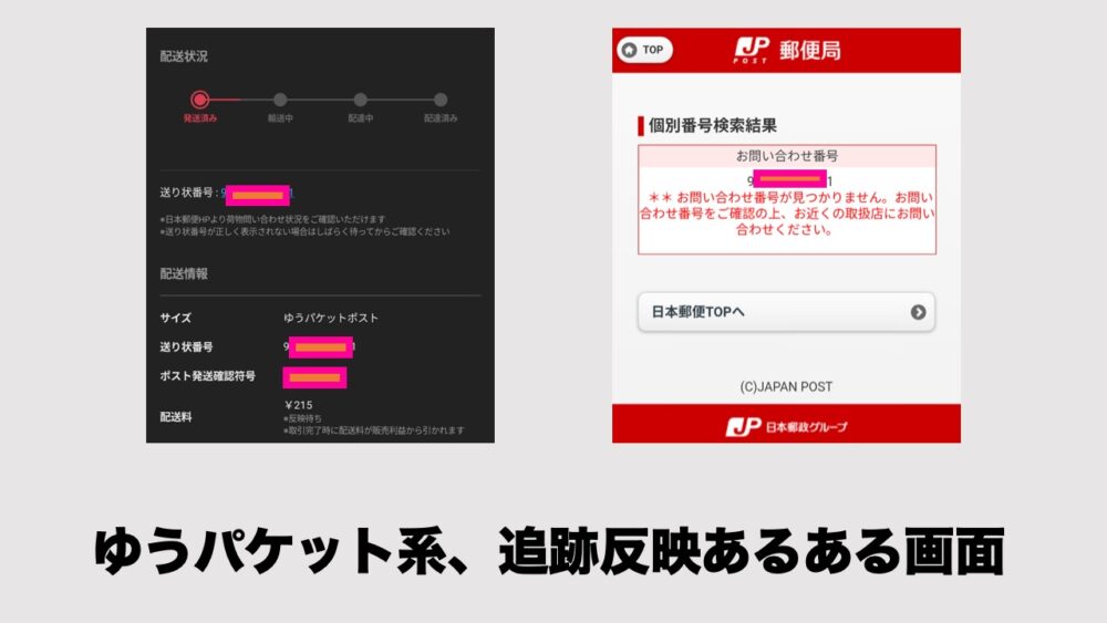 ゆうパケットポストの荷物を夕方ポスト投函し、翌朝に購入者から 「問い合わせ番号を追跡したが、番号が登録されてないと表示される。記載の問い合わせ番号は、間違っていないか、確認して。」 とメッセージが。