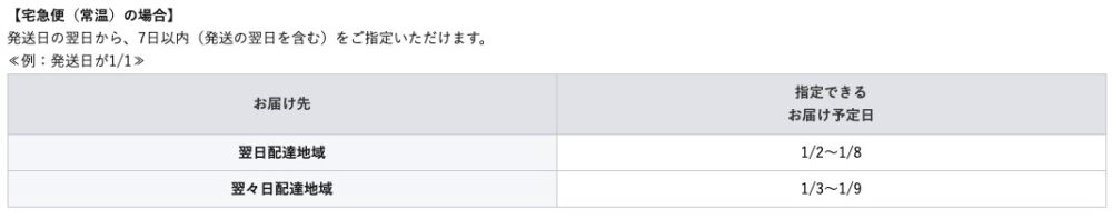 ちなみに巷では「指定なし」で発送すれば最短で届くと言われています。別記事にて紹介しましたが、宅急便・宅急便コンパクトは概ね発送から1〜2日後に到着します。そして日付指定できる範囲は公式曰く「発送日の翌日から7日以内(発送の翌日を含む)」なので、最初から最短で届くようになっていると考えられます。