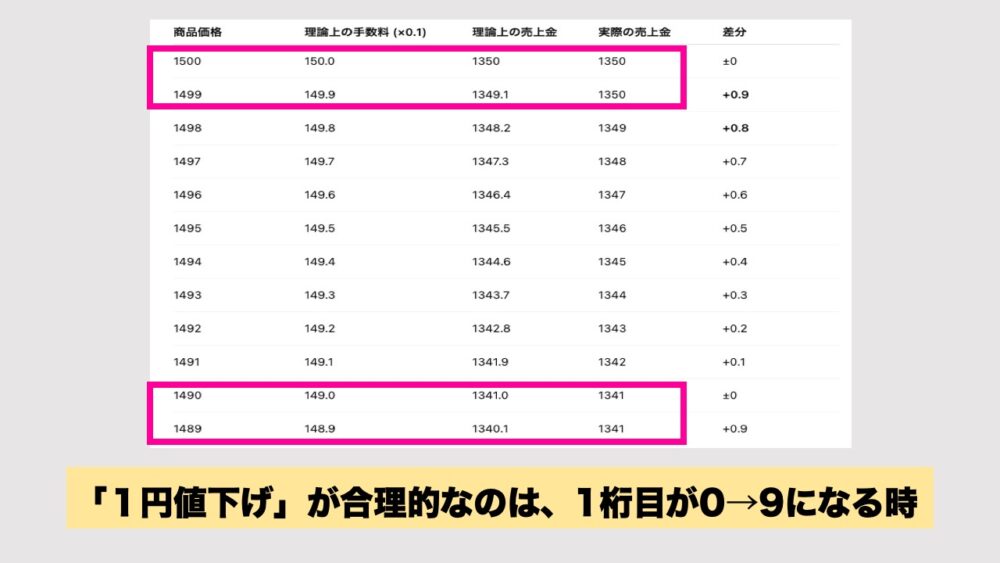 ただし「1円値下げ」が合理的なのは1の位が0の時だけだと思ってください。上図のように例えば1495円から値下げすると販売代金も1円値下げされます。