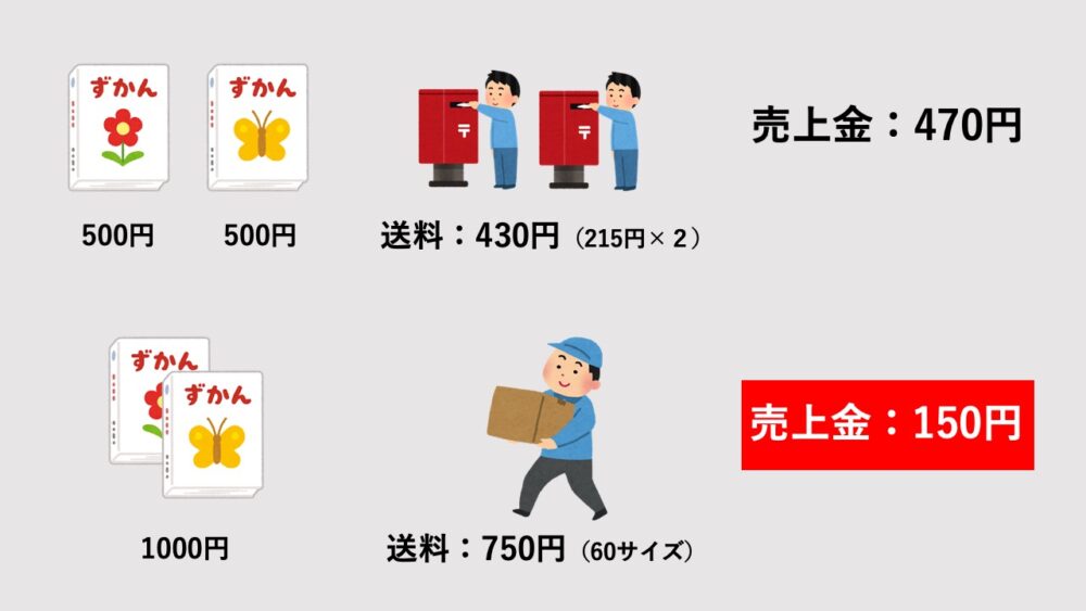 合計金額が同じでも、送料が跳ね上がるため売上金が下がってしまうケースがあるのです。そのため商品によっては「まとめ買い不可」と書かれている場合があります。