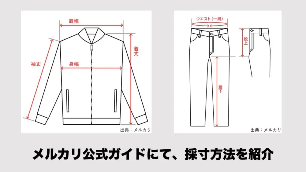 着丈・身幅・肩幅などの実寸を記載しましょう。メルカリ公式ガイドに詳しい測定方法がありますので参照してください。
