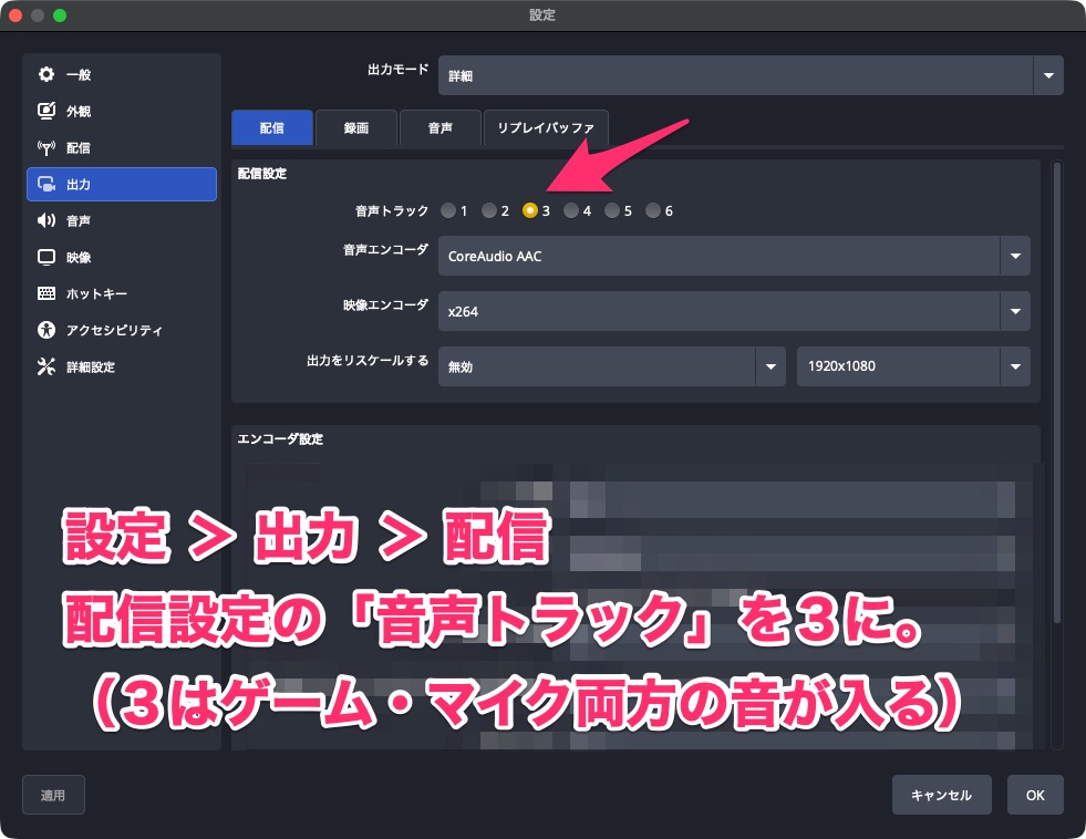 最後に、コントロールにある 設定>出力>配信より、配信設定の「音声トラック」を調整。ここでは【3】のみチェックしましょう。先ほど設定したように、トラック3 にはゲーム音声・マイクが合成されます。