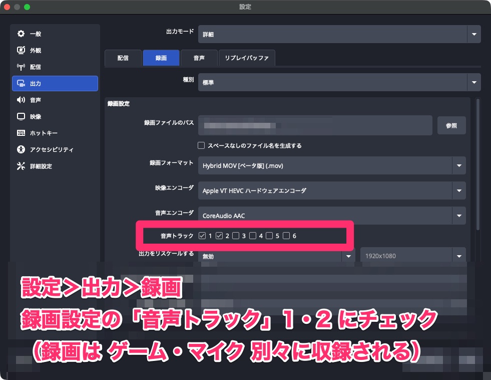 続いて、コントロールにある 設定>出力>録画より、録画設定の「音声トラック」を調整します。ここでは【1・2】にチェックを入れてください。