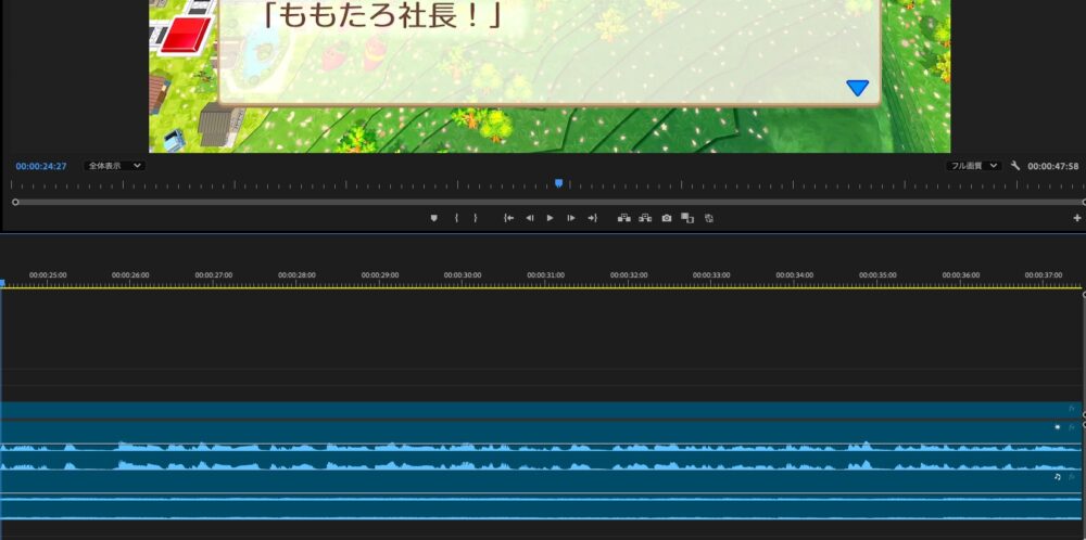 動画編集ソフト(Premiere Pro)で確認。ゲーム音声・マイクが別々に収録されていました。参考までに、配信した動画を下に載せておきます。音の確認として活用ください。