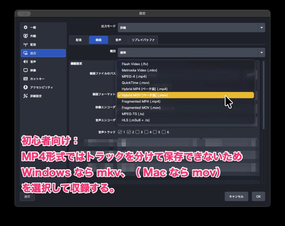 初心者に向けて。初期設定であるMP4形式ではトラックを分けて収録できません。Windows なら mkv、Mac なら mov を選択し、Premiere Pro等の動画編集ソフトに対応したファイルで保存しましょう。