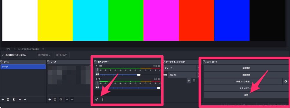 また、今回使うのは「音声ミキサー」の左下にある設定、そして「コントロール」にある設定の2つです。押さえておきましょう。
